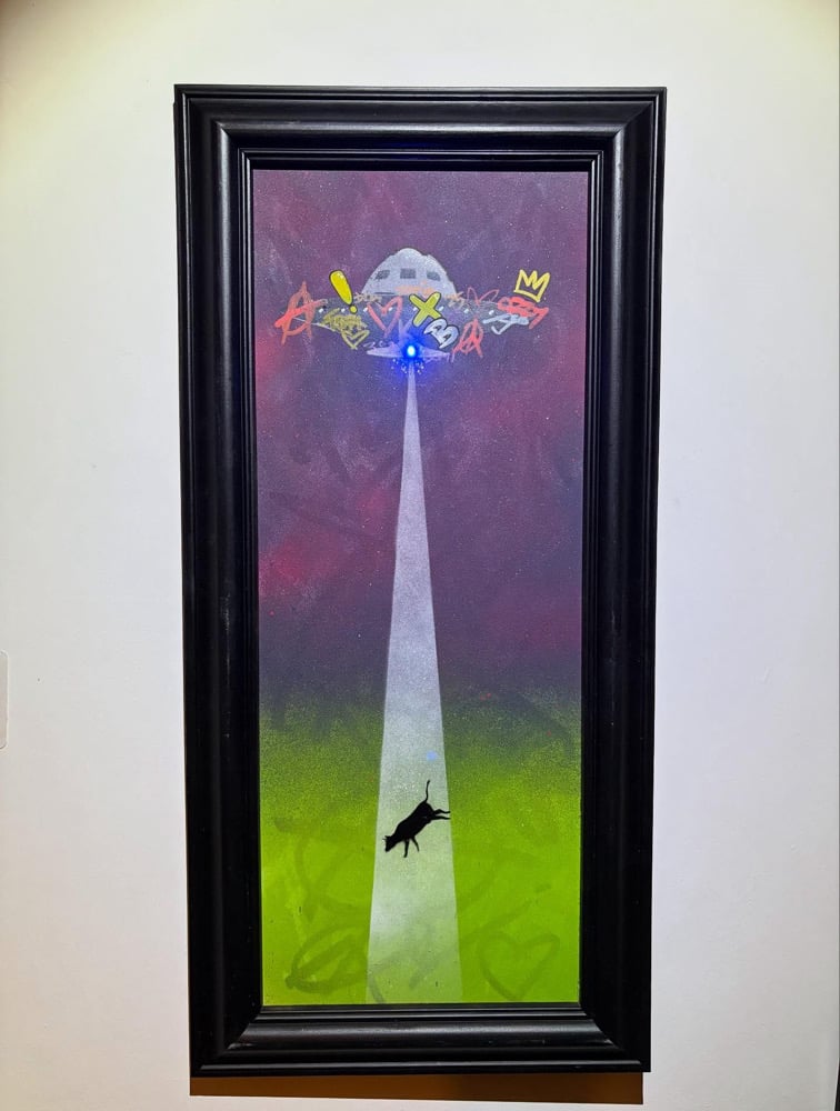 Hand cut and sprayed stencil on board. UV reactive ‘beam’.